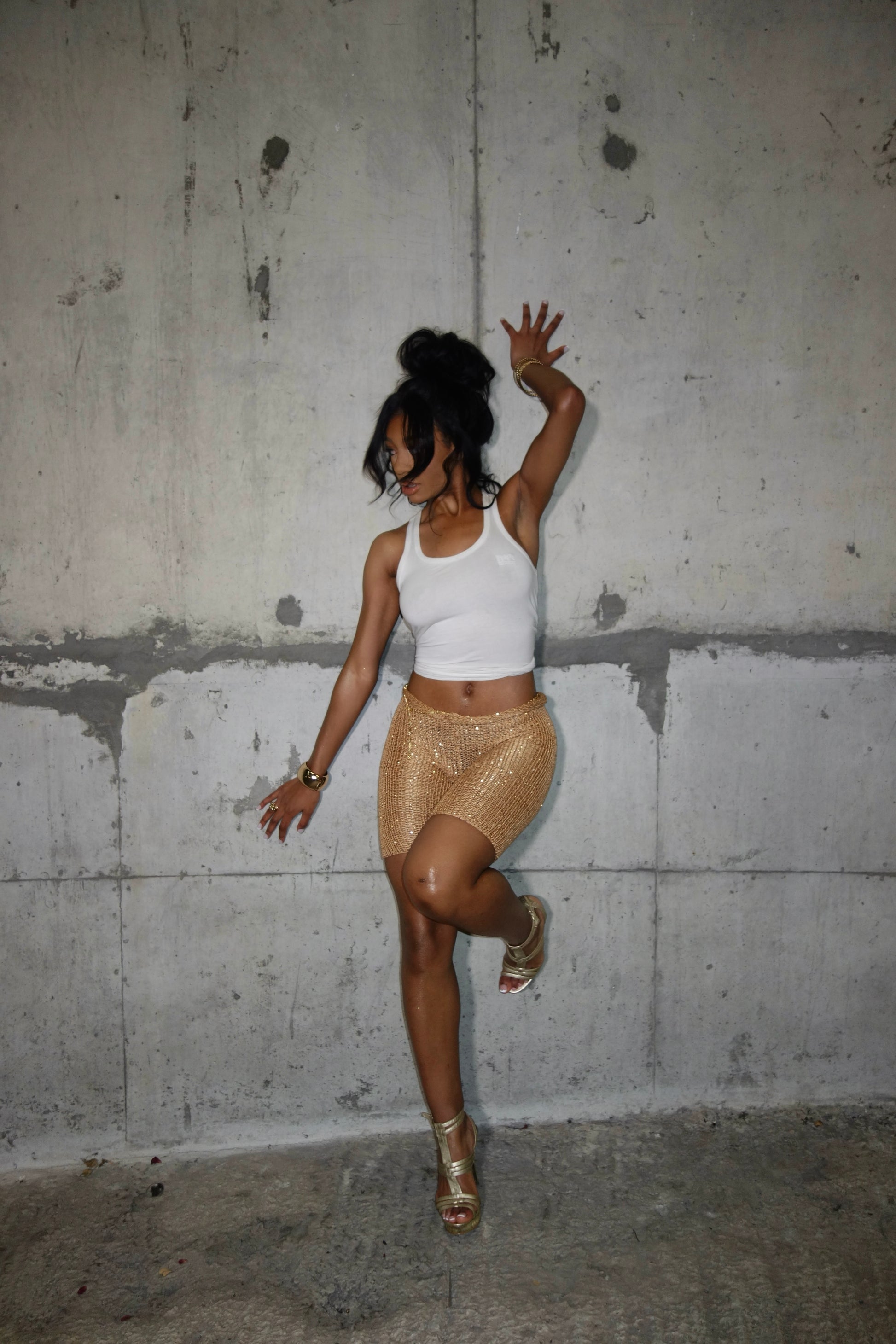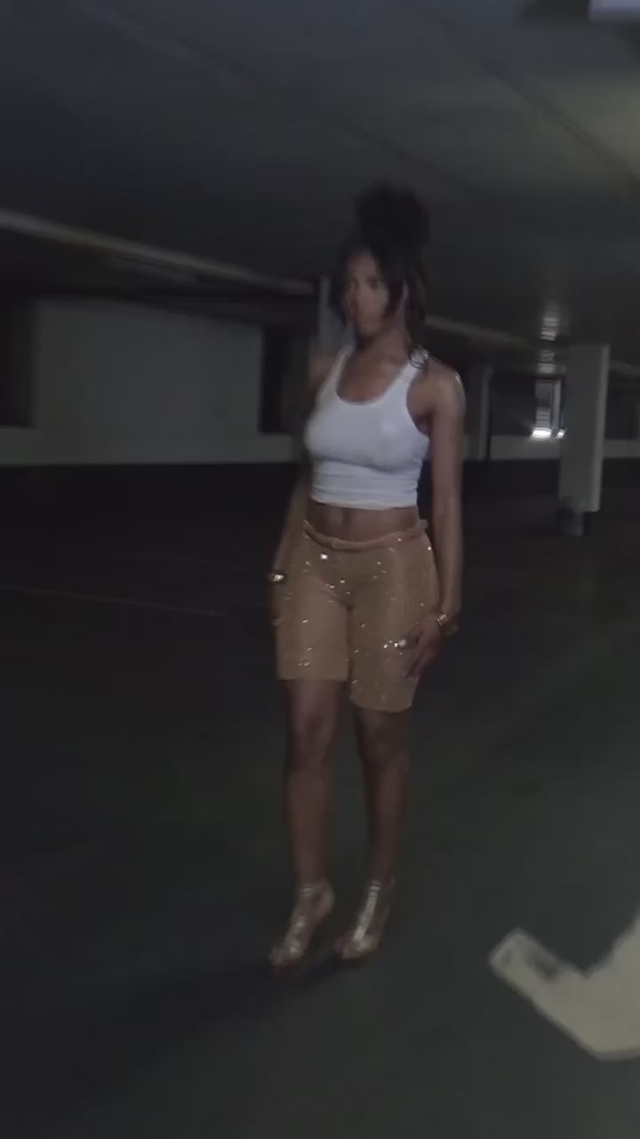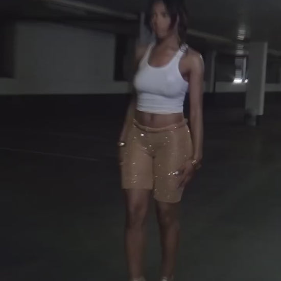 Handmade knitted gold-bronze sequin capris, carefully crafted.